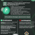 В нашей республике разрешено покупать и продавать криптовалюту за денежные средства (белорусские рубли, иностранную валюту или электронные деньги) только у криптобирж (операторов обмена криптовалют), являющихся резидентами Парка высоких технологий. Совершение операций по купле (продаже) криптовалюты на иностранных криптобиржах и у физических лиц является незаконным и запрещается. Порядок осуществления сделок с криптовалютой определен Указом Президента Республики Беларусь от 20.09.2024 № 367, за нарушение которого предусмотрена ответственность по ч.3 ст.13.3 КоАП в виде штрафа с конфискацией всей суммы дохода.
